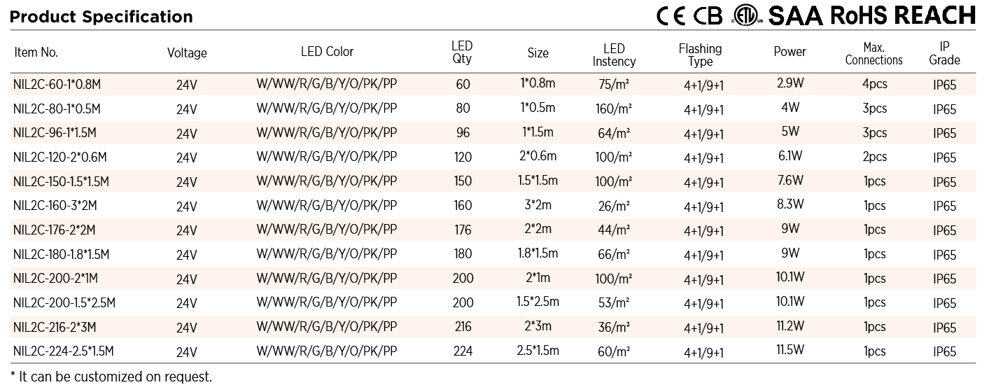 White / Warm White / Red / Green / Blue / Yellow / Orange / Pink / Purple / RGBY(4-Color Arrangement) / Customize |