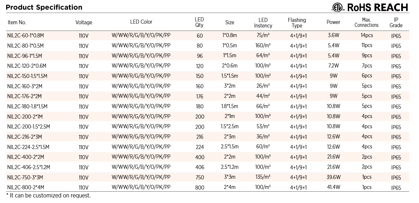 White / Warm White / Red / Green / Blue / Yellow / Orange / Pink / Purple / RGBY(4-Color Arrangement) / Customize |