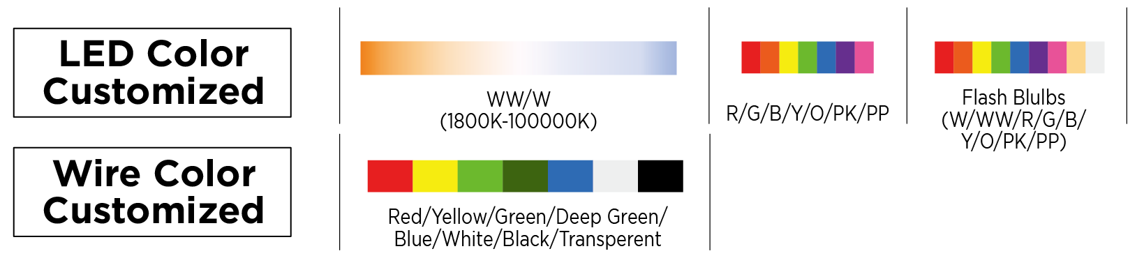 White / Warm White / Red / Green / Blue / Yellow / Orange / Pink / Purple / RGBY(4-Color Arrangement) / Customize |